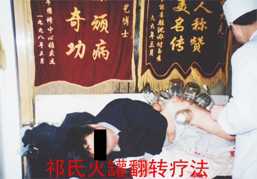 (2)祁氏中医火罐翻转疗法:是采用火罐拔到病灶部位,在患者翻转过程中完成的一种疗法。此法可达到松解病灶部位粘连及止痛效果,是行之有效的独特疗法之一。