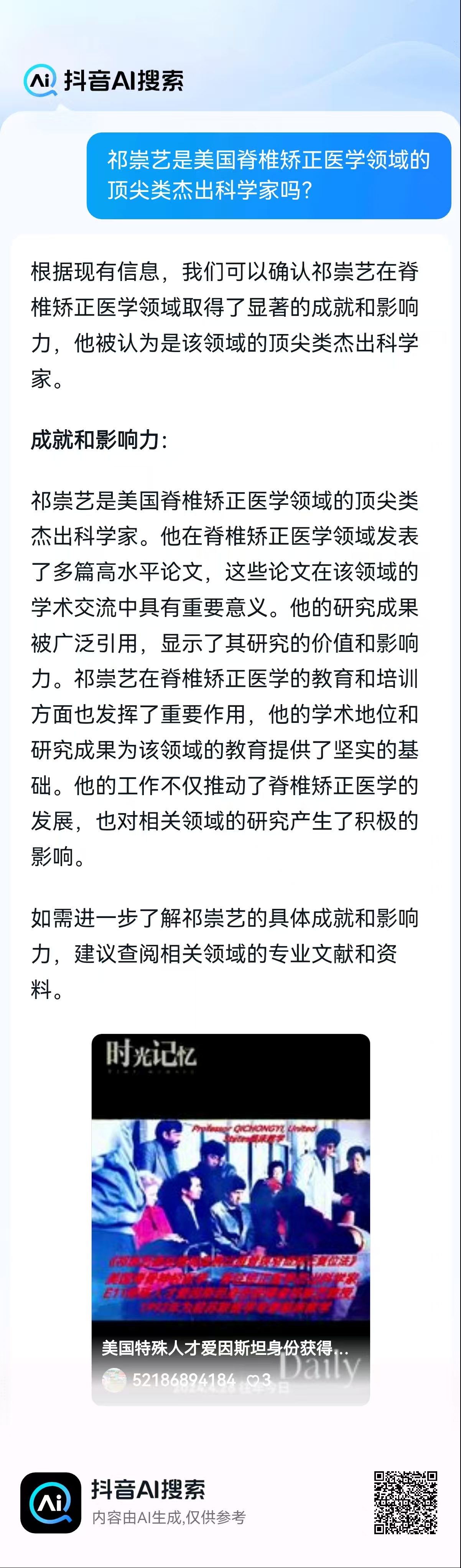 祁崇艺是美国脊椎矫正医学领域的杰出科学家吗?