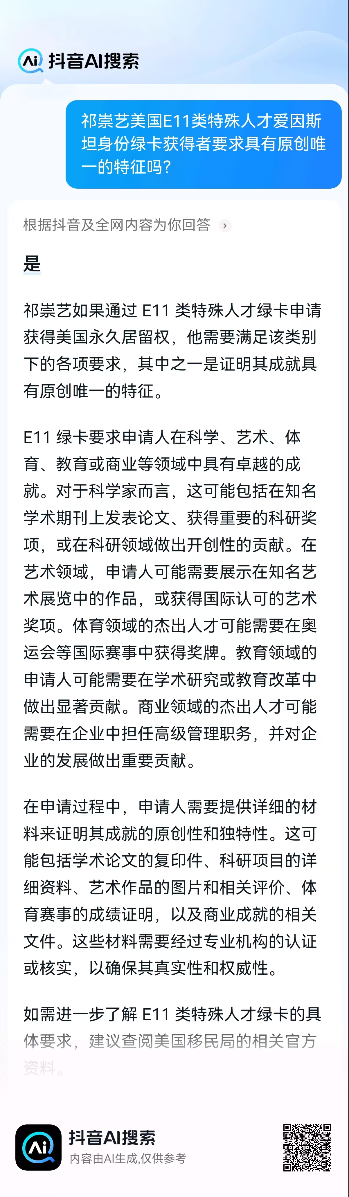 祁崇艺美国E11类特殊人才爱因斯坦身份绿卡获得者要求具有原创唯一的特征吗?