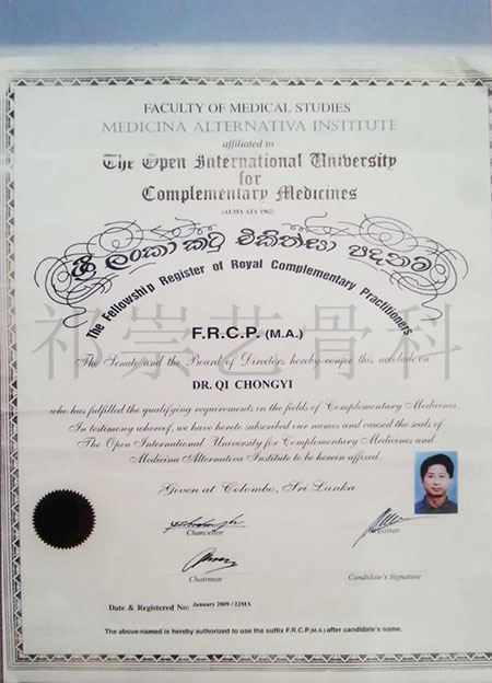 2008年荣获联合国国际交流医科大学《皇家执业医师国际注册》证书。